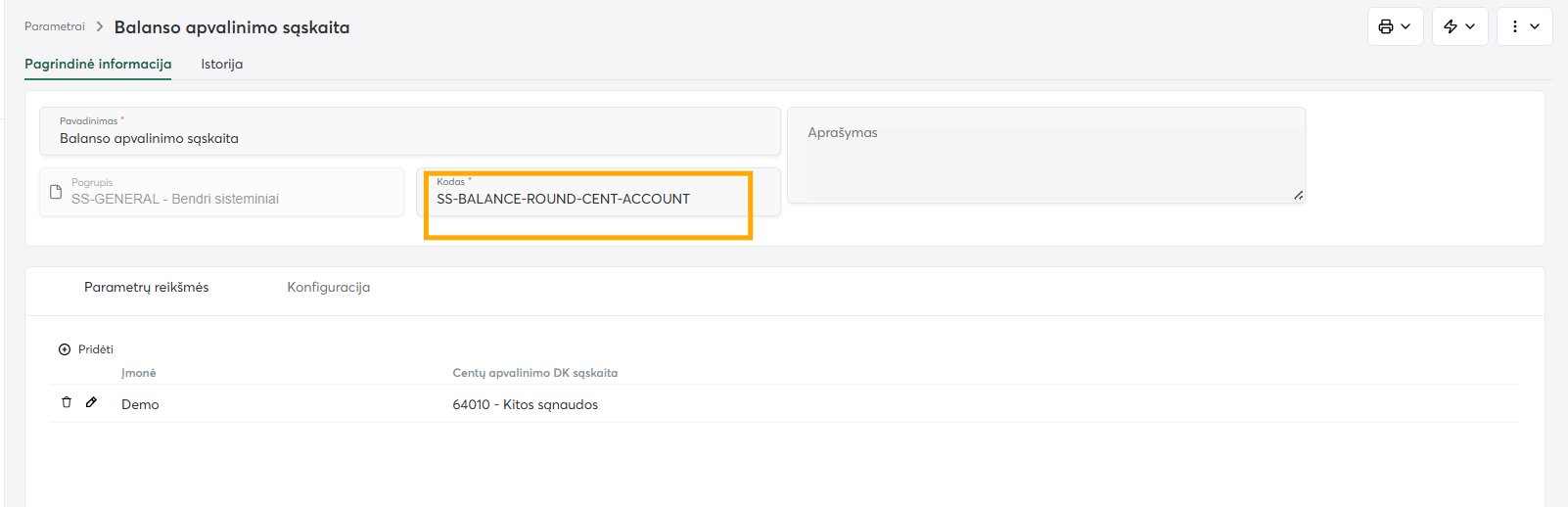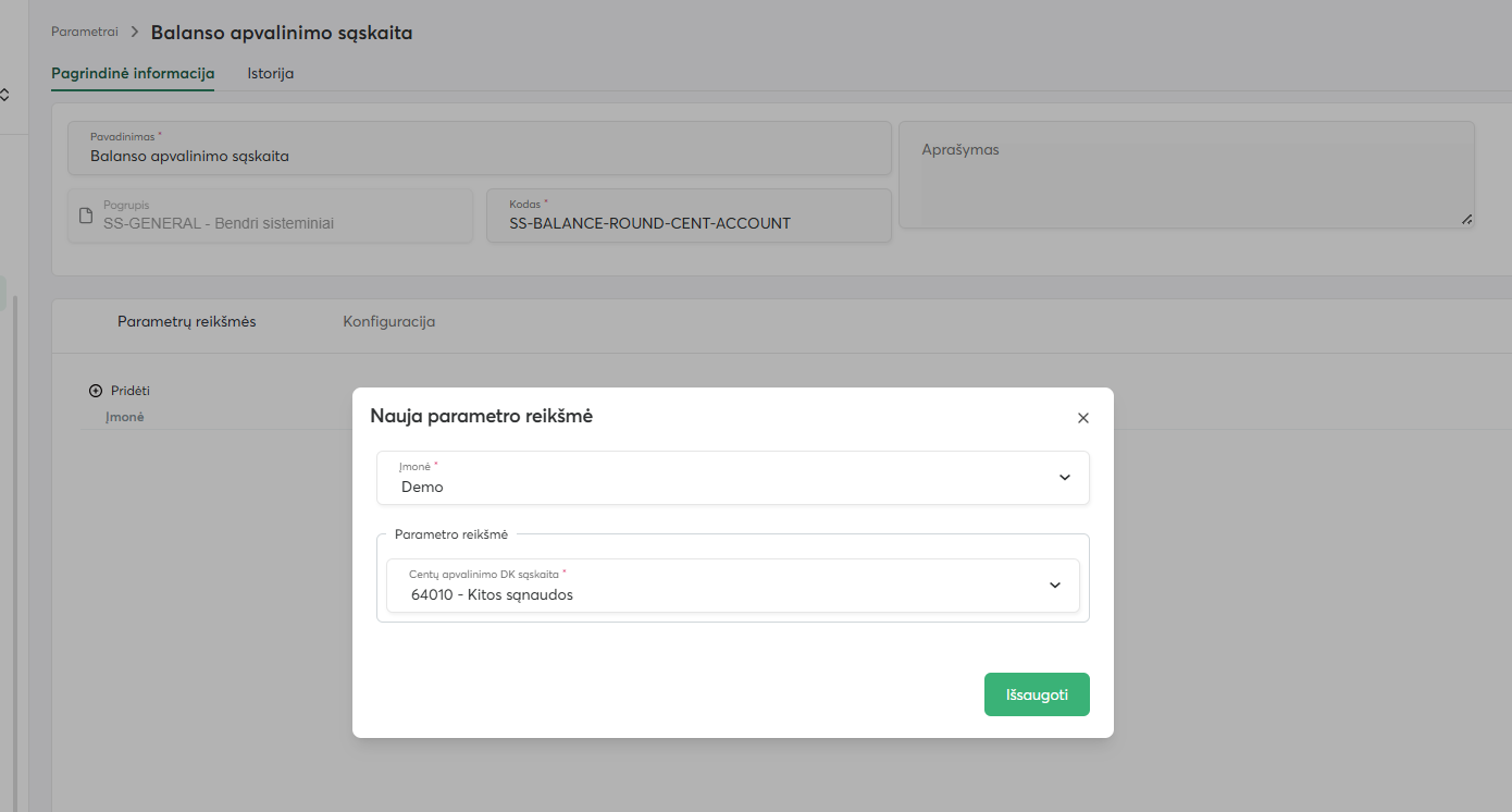 Ataskaitos parametrų nustatymas prieš vykdant ataskaitą, būtina užpildyti šiuos laukus:Svarbu, jeigu pasirenkamas požymis "Be centų", reikia nustatymuose nurodyti apvavinimo sąskaitą (Nustatymai → Bendrieji → Parametrai → SS-BALANCE-ROUND-CENT-ACCOUNT).Užpildžius nustatymą spausti mygtuką Išsaugoti. Parametras; Balanso apvalinimo sąskaita