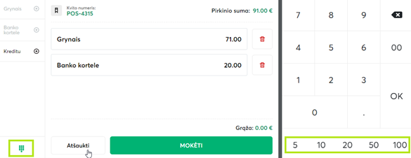 Pastaba: Paimamus iš klieno grynus pinigus (banknotą) patogu įvesti naudojant banknotų mygtukus. basket